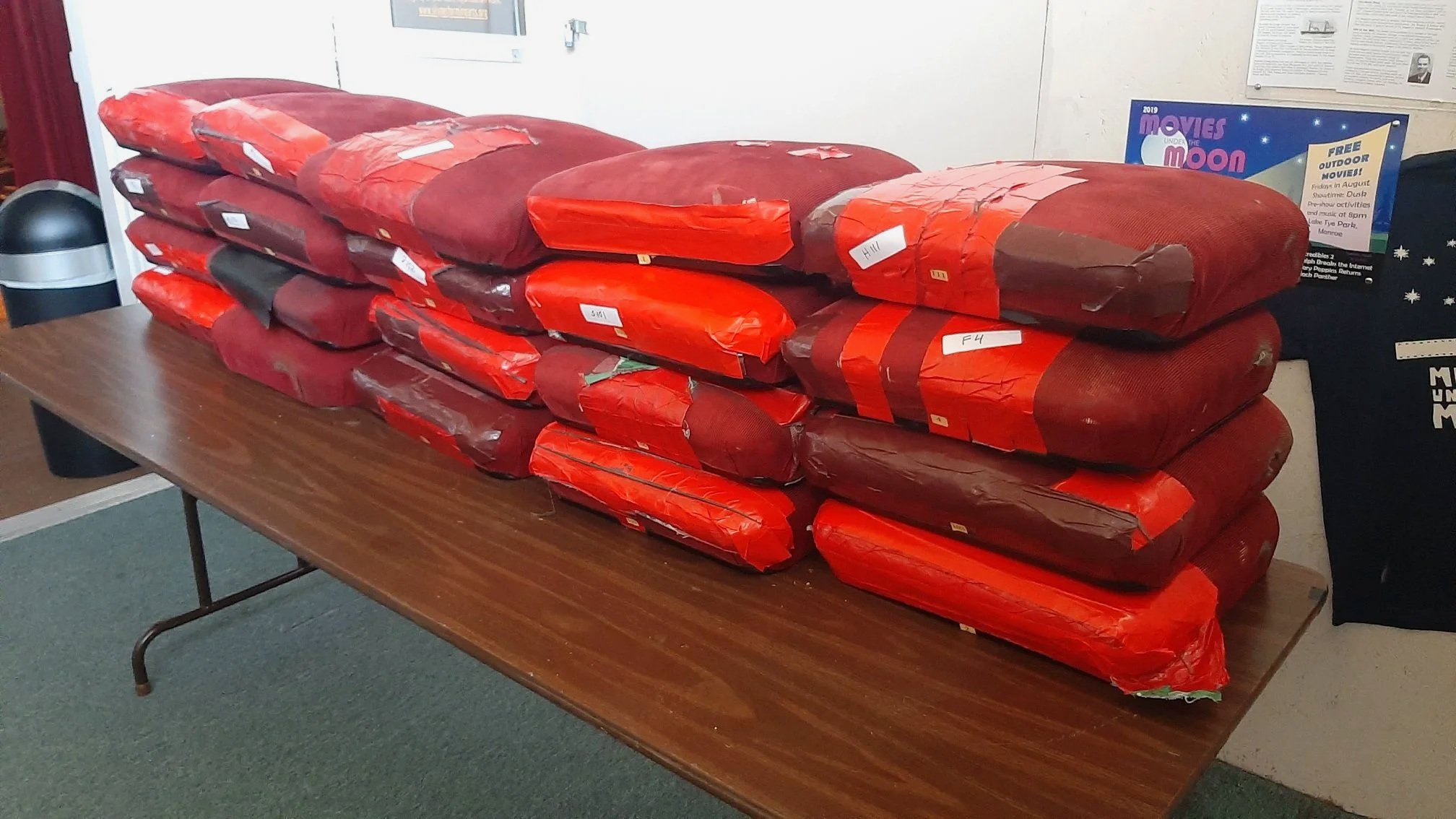 A few years ago, most of the seats in the Wagner Performing Arts Center were still covered in their original, tattered 1939 upholstery fabric. They had suffered years of deterioration and bad repair jobs. This is the first batch we sent out to Monroe Upholstery. It seemed like there was more duct tape than fabric!
